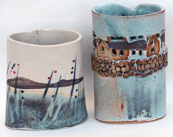 A range of hand-built and thrown pottery, original paintings either mounted or framed, digital prints.